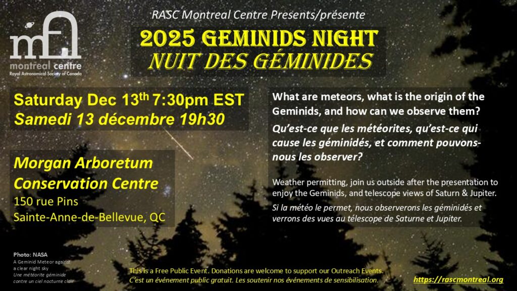 Join us this Saturday, Dec 13th, for our last Public Event of the 2025 season. RASC Montreal invites you to a cold, almost moonless night to learn about the Geminids Meteor Shower, what causes them and how do we observe them. After an indoor presentation, if the winter weather allows we will enjoy the winter night sky with telescope views of our solar system giants – Jupiter & Saturn – and hopefully some Geminids crossing our view.