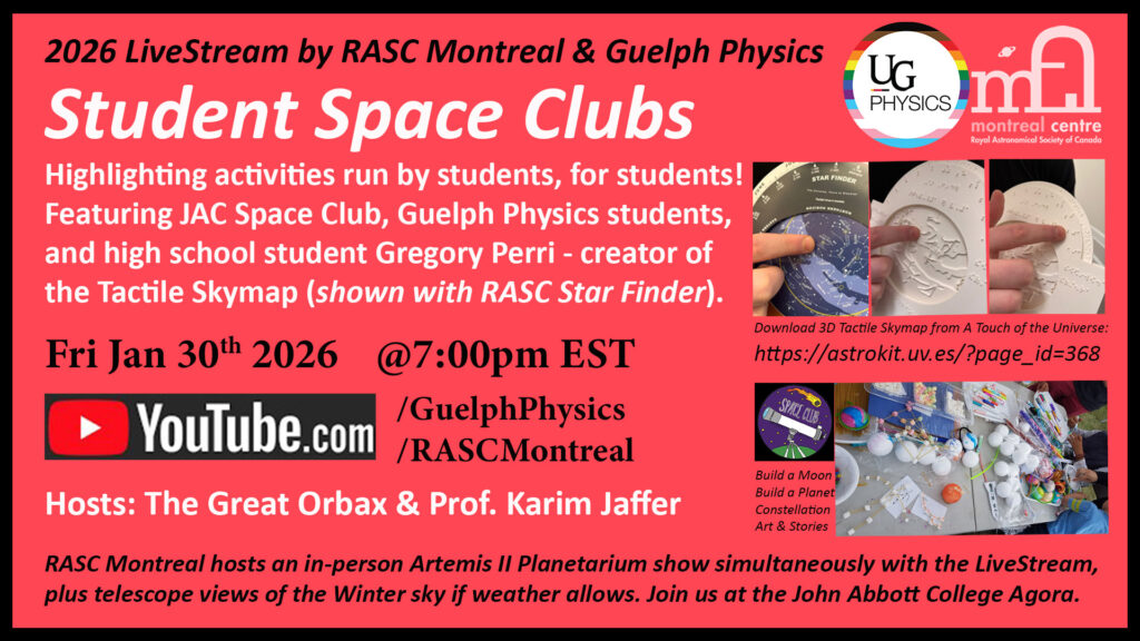 Our annual LiveStream with Guelph Physics will be broadcast live from the John Abbott College Agora and will focus on Student Space Clubs.
